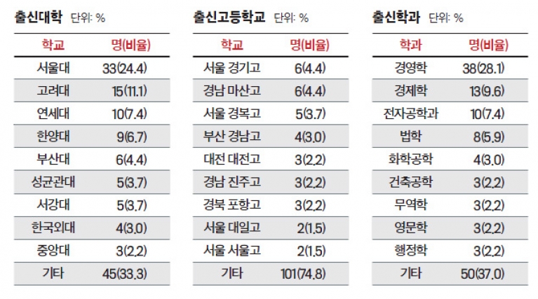 전공별로는 예상대로 경영학도가 가장 많았다. 학부 기준 경영학과를 졸업한 사람이 38명으로 전체의 4분의 1을 넘는다. 고려대 경영학과 출신이 8명으로 가장 많고, 서울대 경영학과(7명), 연세대 경영학과(3명) 순이다. 경영학에 이어서는 경제학(13명)이 뒤를 이었고 전기·전자공학 전공이 10명으로 세 번째로 많았다.