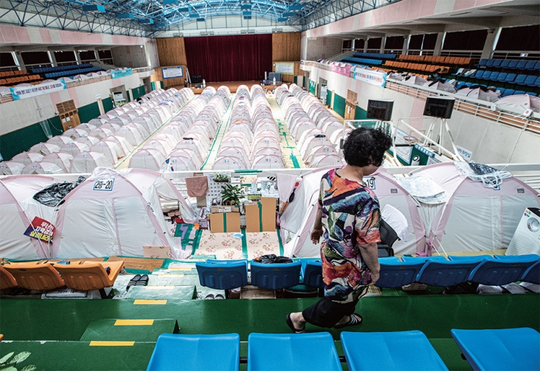 실내는 200여 개의 분홍색 텐트가 다닥다닥 붙어 경기장 바닥과 2층 관중석을 채웠다. 어른 두 명이 누우면 몸을 뒤척이기 빠듯할 정도의 크기다. 지붕에서 새는 빗물을 받는 양동이도 군데군데 놓여 있다. 바닥에는 얇은 매트를 깔았다. 허리와 관절이 약한 노인들에게 딱딱한 냉바닥이 건강에 좋을 리 없다. 인근 보건소나 의원에서 물리치료를 받는 게 이곳에 사는 주민들의 일상이다.