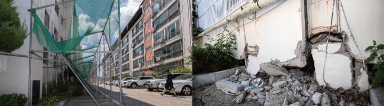 5층짜리 3개 동이 있는 대성아파트는 한눈에 봐도 건물이 뒤틀려 기울어 있었다. 이곳 주민들은 추후 재건축하기로 합의하고 모두 집을 비웠다. 빈 아파트 입구에는 쇠사슬이 걸렸고, 경찰이 설치한 임시 초소가 지키고 있다.