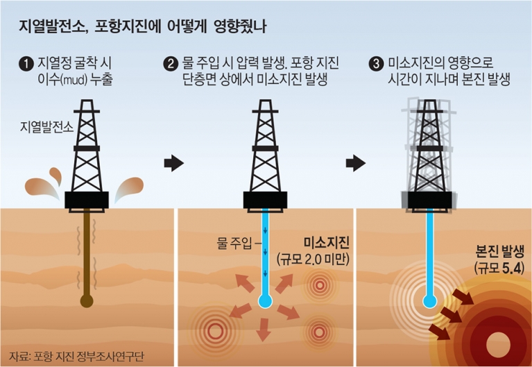 지열발전소는 지하 5000m 깊이까지 구멍을 뚫어 고압으로 물을 주입하고 높은 지열로 생긴 수증기로 터빈을 돌려 전기를 얻는다. 물이 주입되면 지하는 마치 압력솥처럼 내부 압력이 높아진다. 이때 단층을 만나면 엉뚱한 곳으로 압력이 표출되고, 지반을 자극해 지진이 발생한다. 활성단층은 지열발전소의 가장 큰 위협 요소다. 본지진이 일어나기 전 활성 단층의 존재를 암시하는 이상 현상이 꾸준히 관찰됐지만 넥스지오 측은 가동을 멈추지 않았다.