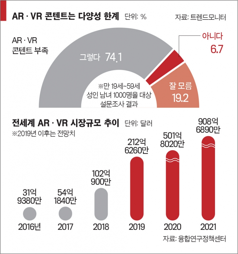 업계에선 AR·VR 콘텐트에 대한 소비자 반응이 나빠 지금은 관련 콘텐트를 만들 이유가 없다는 얘기가 나오고 있다. 곽태진 유니브이알 대표는 “AR·VR 콘텐트가 꽃피기 위해선 네트워크·디바이스·콘텐트·플랫폼으로 이어지는 네 가지 축이 유기적으로 작동해야 한다”면서 “국내 5G 시장은 네트워크조차 제대로 작동하지 않는 상황에서 AR·VR 콘텐트의 성장 가능성만 낙관하고 있다”고 지적했다. 실제 포켓몬고 출시 이후 구글 플레이나 앱스토어 등 애플리케이션(앱) 장터에서 500위 안에 든 VR·AR 콘텐트는 단 하나도 없는 것으로 나타났다.