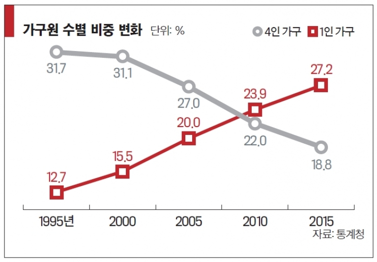 국내에서 1인 가구 비중은 1995년 12.7%에서 2000년 15.5%로 늘어났고, 2005년에는 20%를 기록했다. 2010년에는 1인 가구 비중이 23.9%를 기록하며 22%로 줄어든 4인 가구 비중을 처음으로 앞질렀다. 2015년 27.2%를 기록한 1인 가구 비율은 2020년에는 30%를 찍을 것으로 예상된다.