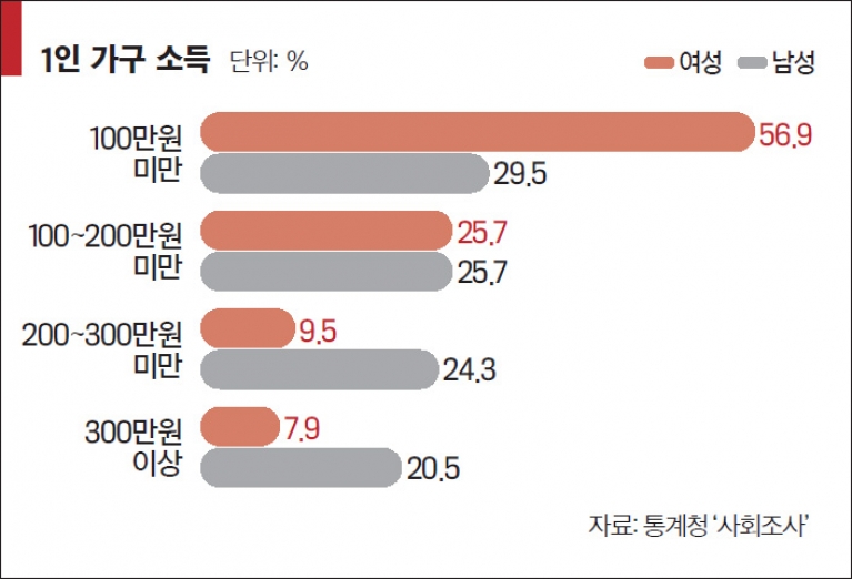 결혼을 해야 한다고 보는 남성은 지난해 52.8%로 아직은 여성보다 높았지만, 실제 1인 가구 중에서 항상 여성이 많던 것에 비해 최근 들어 남녀 1인 가구 비중은 거의 비슷해졌다. 남성들도 결혼과 거리를 두는 경향이 높아진 것. 보건사회연구원이 발표한 ‘청년층의 경제적 자립과 이성교제에 관한 한일 비교연구’라는 보고서에서 2015년 현재 25~29세 여성 미혼율은 30%에서 77%로 늘어났지만, 같은 나이대 남성 미혼율은 무려 90%로, 1995년 65%에 비해 크게 늘어났다.