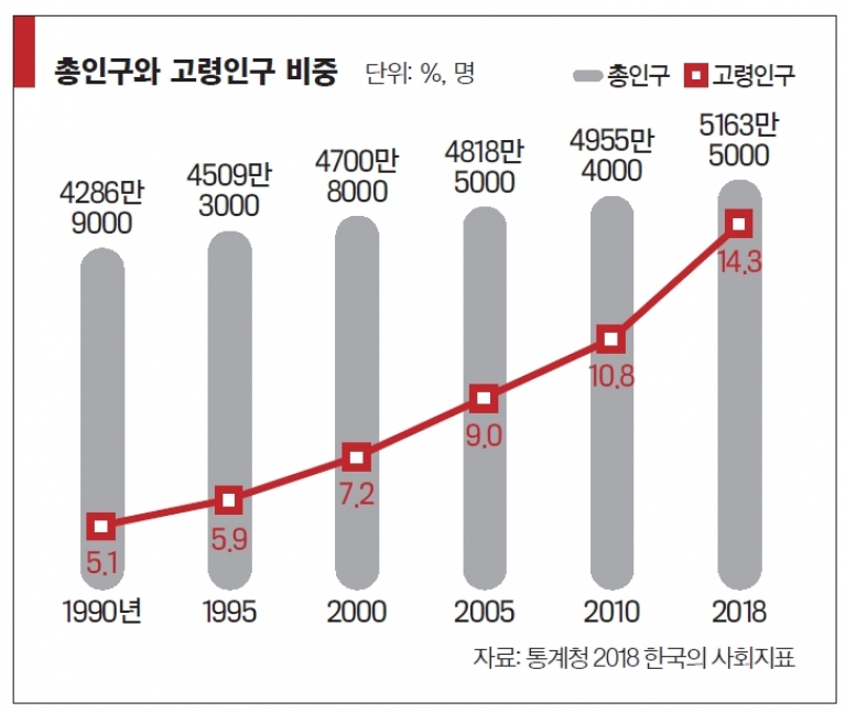 통계청의 ‘2018 한국의 사회지표’에 따르면 지난해 우리나라 총인구는 5163만5000명으로 전년 5144만6000명보다 18만9000명(0.37%) 증가했다. 전체 인구를 일렬로 세워놨을 때 한가운데 위치하는 중위연령은 42.6세로 2010년 37.9세보다 무려 4.7세가 많아졌다. 특히 65세 이상 고령인구가 738만명으로 14.3%를 차지했다.