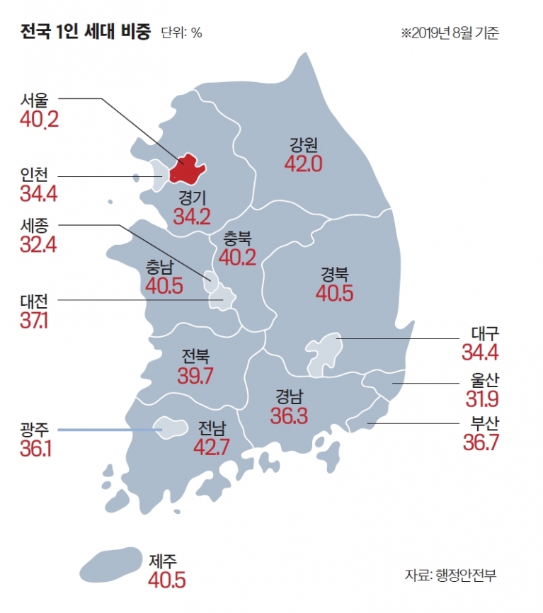 1인 가구의 증가는 서울만의 일은 아니다. 이미 전국 17개 광역지자체에서 1인 가구 비중이 30% 이상을 기록했으며 40%를 초과한 지자체도 전남(42.7%)·강원(42%)·충남(40.5%)·경북(40.5%)·제주(40.5%)·서울(40.2%)·충북(40.2%) 등 7곳이나 된다.
