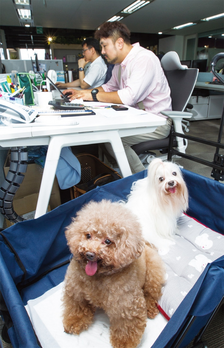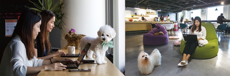 몽이의 견주 최은진(35) 세일즈팀 과장은 ”일을 할 때 집에 혼자 있을 몽이 걱정을 하지 않아도 되고, 몽이 덕분에 다른 동료들과 빨리 친해질 수 있었다”고 말했다. 브랜드 세일즈 등 실제 업무에 도움이 되기도 한다. 5개월 된 양주의 견주 홍순기(42) 영업부 차장은 “양주를 키우면서 어떤 사료와 간식이 잘 맞는지를 경험하게 돼 고객사를 설득하기가 쉬워졌다”고 말했다.