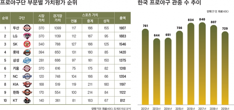 구단의 경제적 가치 얘기는 지금부터다. 포브스코리아는 시장·경기장·스포츠 가치를 종합해 2019년 프로야구단의 구단 가치를 따져봤다. 경기 결과와 구단 가치가 일치하는 건 아니지만, 정규시즌 1위인 두산이 구단 가치 순위에서도 1위에 올랐다. 2년 연속 정규시즌에서 우승한 데 이어 구단 가치평가에선 5년째 1위 자리를 지키고 있다. 두산은 관중 동원에서 LG에 이어 2위에 오르는 등 평가 기준 전 분야에서 상위권을 유지했다.
