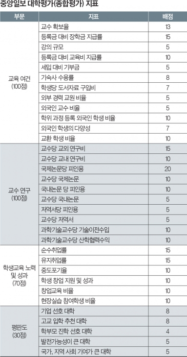 종합평가는 ‘교수 연구’ ‘교육 여건’ ‘학생 교육 노력 및 성과’ ‘평판도’의 4개 부문, 33개 지표로 이뤄진다. 배점은 교수 연구와 교육여건 부문은 각 100점, 학생교육 부문은 70점, 평판도 30점으로 총 300점이다.