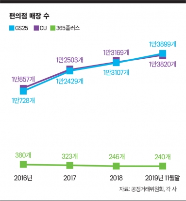 매장 수도 지속해서 늘고 있다. GS25는 2016년 1만728개, 2017년 1만2429개, 2018년 1만3107개, 2019년 11월 말 기준 1만3899개로 확장했다. CU는 2016년 1만857개, 2017년 1만2503개, 2018년 1만3169개, 2019년 11월 말 1만3820개다.