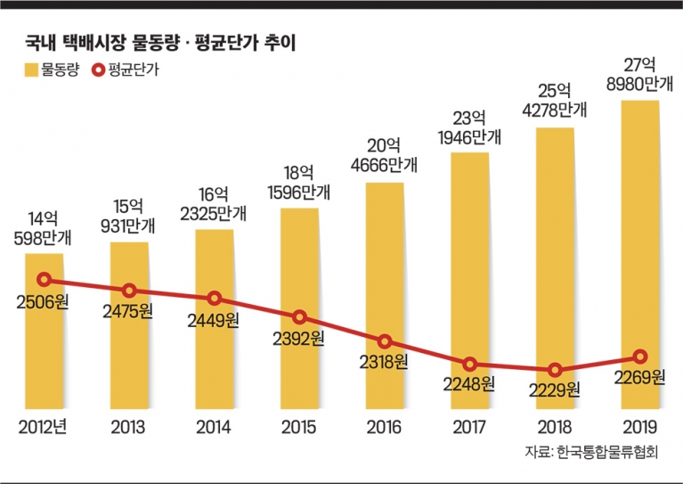 실제 2014년 2449원이었던 택배 시장 평균 배송단가는 2018년 2229원으로 떨어졌다. 이에 CJ대한통운, 한진택배, 롯데글로벌로지스의 영업이익률은 2014년 각각 13.4%, 6.1%, 6.3%에서 2018년 2.0%, 2.2%, 2.8%로 모두 감소했다.