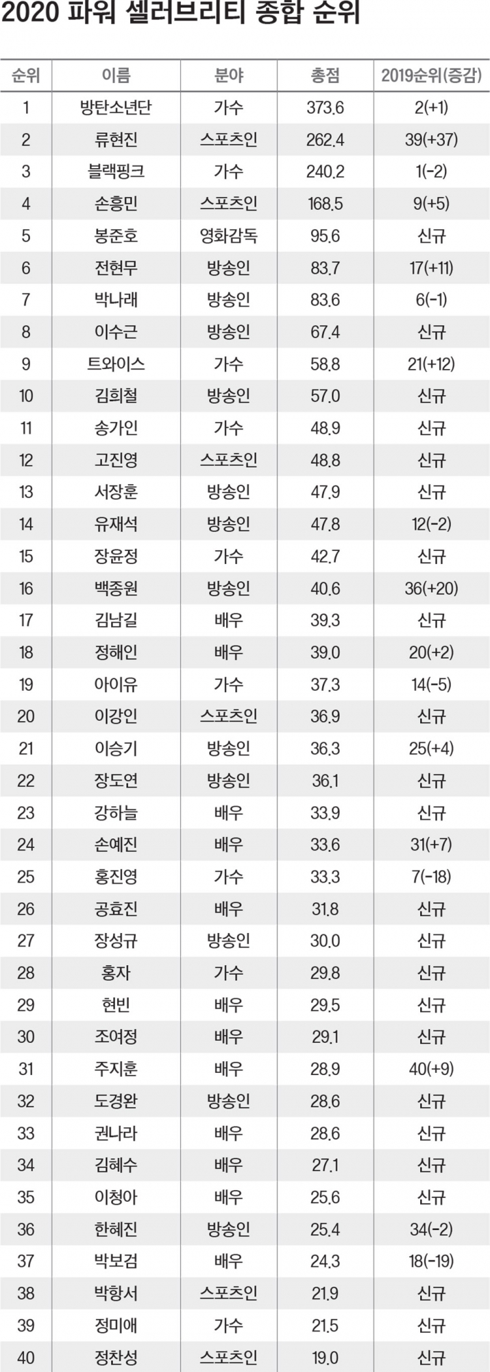2020년 파워 셀러브리티 선두 자리는 방탄소년단(BTS)이 재탈환했다. 지난해 신예 걸그룹 블랙핑크에 1위 자리를 내준 방탄소년단은 올해 방송 출연과 SNS, 언론 노출과 수입 등 모든 부문에서 독보적인 활약을 펼치며 두각을 나타냈다. 지난해 미국 메이저리그에서 14승을 거두며 최고의 시즌을 보낸 류현진은 순위가 무려 37계단이나 상승해 2위를 차지했고, 지난 2월 제92회 아카데미시상식에서 영화 [기생충]으로 작품상, 감독상, 각본상, 국제장편영화상 등 4개 부문을 석권한 봉준호 감독이 5위에 이름을 올렸다. 각종 예능프로에서 맹활약을 펼치고 있는 전현무(6위)와 박나래(7위), 이수근(8위), 김희철(10위) 등이 가수들을 대신해 새롭게 10위권에 진입했다.