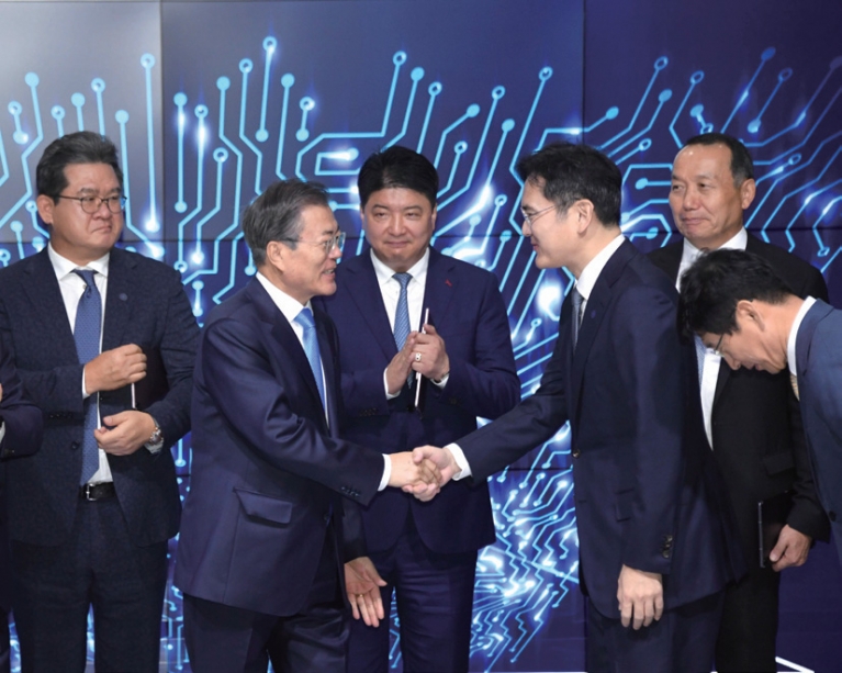이재용 삼성전자 부회장이 지난해 10월 10일 삼성디스플레이 아산공장에서 열린 신규 투자 및 상생협력 협약식에서 문재인 대통령과 악수하고 있다. / 사진:청와대사진기자단