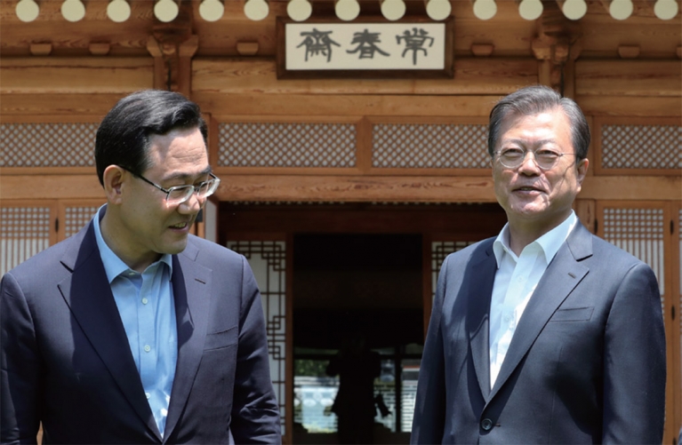 지난 5월 28일 청와대에서 만난 두 사람의 대화다. 문 대통령은 이날 청와대에서 신임 주호영 미래통합당 원내대표, 김태년 더불어민주당 원내대표와 만났다. 3차 추경처리, 신한울 원전 3·4호기 공사 중단, 고위공직자범죄수사처 등 최근 국정현안에 관해 묻고 답하는 과정에서 나왔다.
