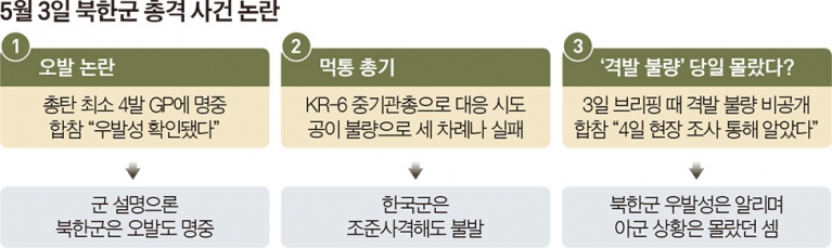 합참의 설명대로라면, 짙은 안계로 시계가 0.5~1㎞에 불과한 상황에서 오발했는데도 탄착군을 형성하며 명중시켰다. 거의 영화에 나오는 전문 스나이퍼(저격수) 수준이다. 하지만 합참은 북한군 교신 등 여러 정황을 종합해 초지일관 ‘우발적 총격’이라고 강조한다. 고사총 사격을 하려면 안전장치부터 풀어야 한다. 총기 점검은 탄창을 빼고 하는 게 상식이다. 10년씩 장기 복무하는 최정예 북한 GP 근무 민경대원들이 그런 실수를 할 가능성이 있을까?