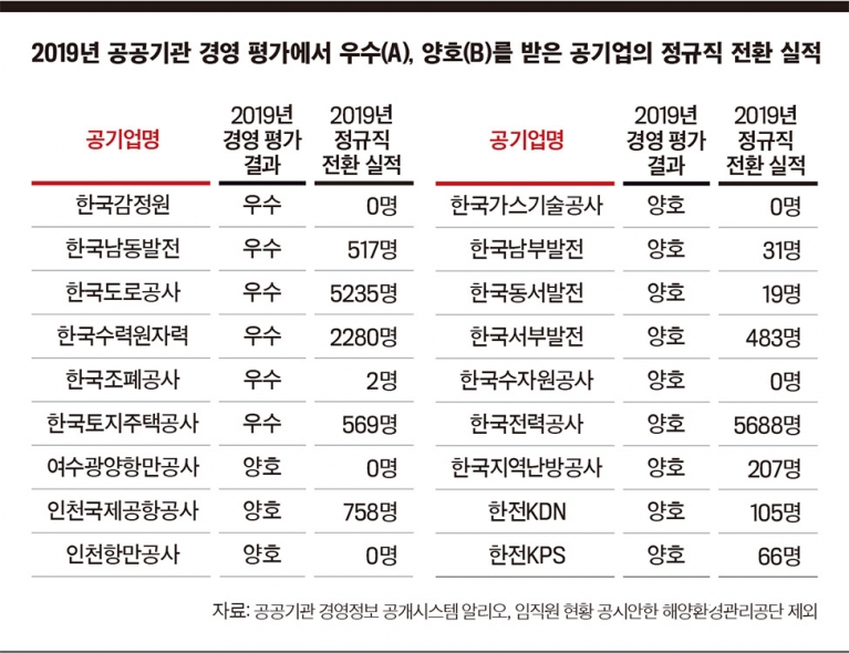 실제 공공기관 경영정보 공개시스템 ‘알리오’에 따르면 지난해 공공기관 경영 평가에서 우수(A)를 받은 한국수력원자력은 지난해 2280명의 비정규직 근로자를 정규직으로 전환시켰다. 그런데 한수원의 지난해 연결기준 영업이익은 7831억원으로 2018년(1조1456억원)보다 32% 감소했다. 지난해 1조2765억원에 달하는 영업손실로 이른바 ‘최악의 성적표’를 받은 한국전력공사도 양호(B)로 평가됐는데, 지난해에만 5688명의 비정규직 근로자를 정규직으로 채용했다.
