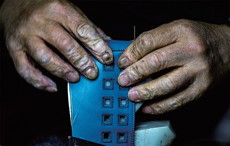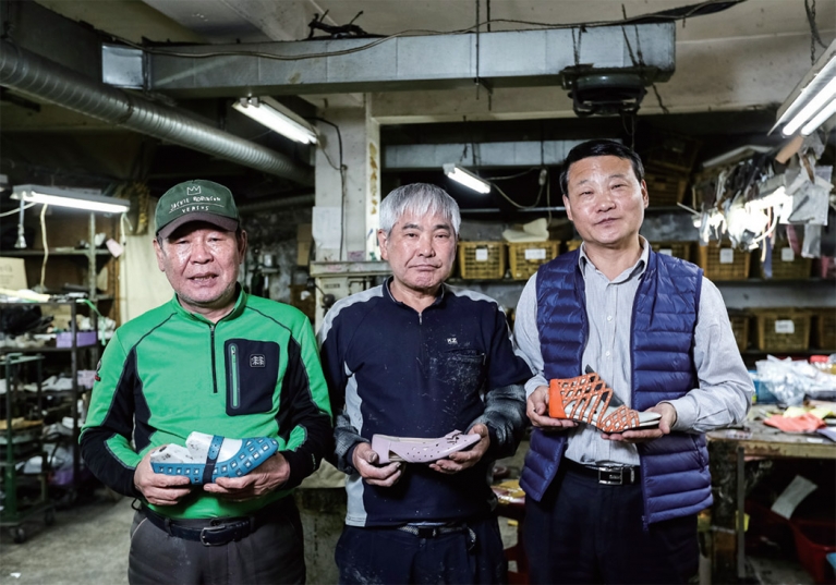 이곳에서 일하는 주형래(68)씨는 디자인에 따라 원단 가죽에 패턴을 만들고, 재단한 뒤 재봉질해 구두 윗부분인 ‘갑피’를 만드는 일이 주 업무이다. 1969년 중학교 졸업 후부터 지금까지 50년 넘게 이 일을 하고 있다. 조광섭(66)씨는 주씨가 만든 갑피를 신발 바닥에 결합하는 ‘저부’ 작업을 맡고 있다. 주씨 못지않은 경력(47년)을 자랑한다.