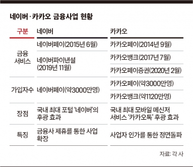 국내 양대 ICT(정보통신기술) 공룡의 전략 차이는 은행업에서도 확인할 수 있다. 카카오는 카카오뱅크를 설립해 인터넷전문은행 라이센스를 받는 형식으로 은행업에 뛰어들었다. 2017년 7월 카카오뱅크 출범 첫날에만 24만명이 계좌를 개설했다. 이후 카카오뱅크는 공인인증서 없는 서비스 이용과 간편 송금이나 마이너스 통장 대출 등을 제공하며 변화하는 은행업계에 이정표를 제시했다는 평가를 받는다.