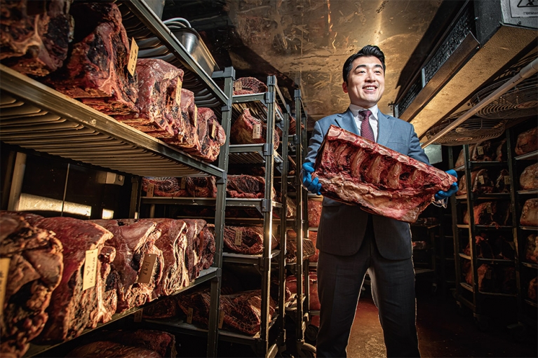 “이곳에서 평균 28일간 숙성해 소고기가 머금은 육향을 최대한 끌어낸 다음 조리에 들어갑니다. 숙성 온도, 숙성 시간, 숙성실 내부의 자재·환경 등 다양한 요소에 따라 고기 맛이 달라져요. 중간중간 고기 위치도 바꿔줘야 합니다. 따라서 숙성을 담당하는 직원의 역량이 중요하죠. 개인적으로 우리 지점의 숙성 담당 직원이 최고의 실력자라고 자부합니다.”