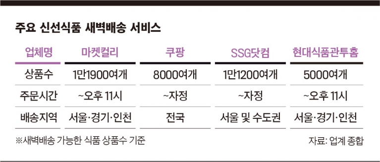 마켓컬리가 지난 2015년 처음 시도한 새벽배송은 이후 쿠팡·SSG닷컴 등 온·오프라인 유통 공룡들이 잇따라 진출하며 급성장했다. 새벽배송의 원조로 불리는 마켓컬리는 현재 1만4000여개의 상품을 밤 11시 이전에 주문하면 새벽 7시까지 배송하고 있다. 전체 상품군 중 식품 비중이 85%에 달하며, 프리미엄 식재료를 갖춰 ‘강남맘 앱’으로 불린다.