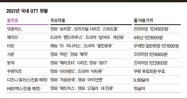 현재 국내 OTT 시장은 글로벌 플랫폼인 넷플릭스와 토종 OTT 플랫폼 웨이브·티빙·시즌·왓챠 등이 주력이다. 이중 넷플릭스가 큰 격차로 시장을 선도하고 있다. 지난해 시장조사업체 닐슨코리안클릭이 조사한 결과에 따르면 넷플릭스 이용자 수는 755만8292명, 뒤를 이어 토종 OTT사인 웨이브가 387만9730명, 티빙이 232만5586명을 보이고 있다. 1위인 넷플릭스의 독과점 체제다. 시즌과 왓챠는 이용자 수가 각각 133만명, 43만명 수준이다.