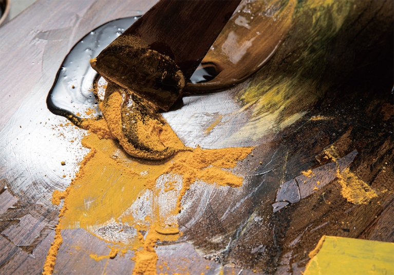 딸 다영(32) 씨는 찹쌀풀과 옻 진액을 1대1로 섞어 만든 ‘호칠’을 이용해 나무에 삼베를 입히고 있다. 아들 민우(39)씨는 옻 진액과 광물 안료를 섞어 물감을 만든다. 방망이 모양 밀대를 앞뒤로 밀며 농도와 색을 조절한다. 민우 씨는 20년 가까이 아버지로부터 기술을 전수받아오고 있다.
