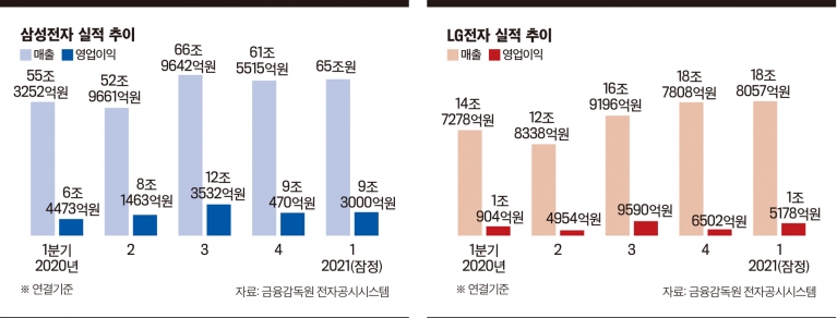삼성전자와 LG전자가 나란히 깜짝 실적을 달성했어요. 삼성전자는 1분기에 9조원 넘는 영업이익을 달성하며 시장 전망치를 웃돌았고 LG전자는 1조5000억원의 영업이익을 내며 분기 사상 최대 실적을 기록했어요. 신종 코로나바이러스 감염증(코로나19) 여파로 프리미엄TV와 가전이 실적 상승의 주역이 됐어요.