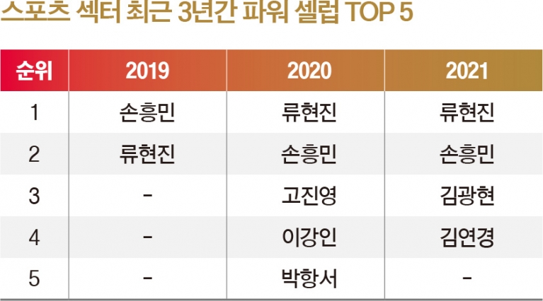 코로나19 바이러스 사태의 직격탄은 스포츠산업도 피해 가지 못했다. 특히 관중과 팬들에게 절대적인 수익을 의존하는 프로스포츠의 경우 무관중 경기, 경기 수 감축 등으로 운영에 큰 어려움을 겪고 있다. ‘2021 파워셀러브리티’ 스포츠 부문에서도 이러한 여파가 여실히 드러났다. 지난해 조사에서 40인 중 6명이 리스트에 이름을 올린 데 비해, 올해는 4명만이 스포츠 스타로 선정됐다. 33% 이상 감소한 수치다.
