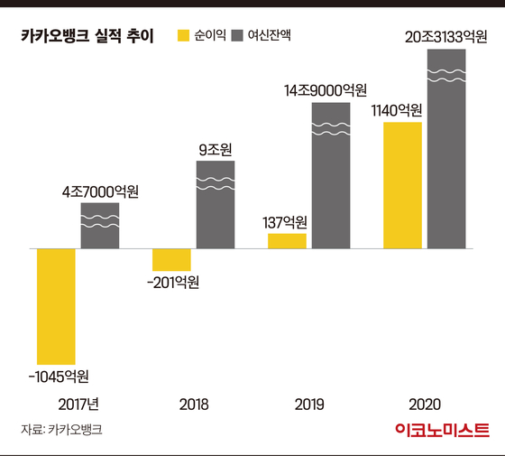 사용자가 늘면서 순익도 급증했다. 카카오뱅크는 지난해 연간 순이익 1140억원을 기록하며 출범 3년 6개월 만에 1000억원선을 넘었다. 2019년 대비 8.3배 늘어난 수치다. 올해 1분기 당기순이익도 지난해 동기 대비 152.43% 늘어난 467억원을 기록했다.