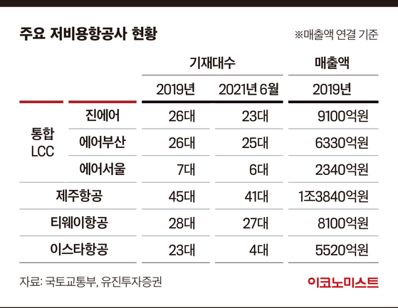 재편 직후에는 통합LCC가 경쟁력 측면에서 앞서 나갈 것으로 보인다. 코로나19가 시작되기 전 매출로 비교하면 통합LCC의 합산 매출액이 같은 기간 제주항공 매출액을 넘어선다. 2019년 제주항공의 연결기준 매출액은 1조3840억원으로, 같은 기간 진에어(9100억원)·에어부산(6330억원)·에어서울(2330억원)의 매출액을 합한 1조7760억원에 못 미친다. 업계 3위를 기록할 것으로 보이는 티웨이항공의 같은 기간 매출은 8100억원이다.