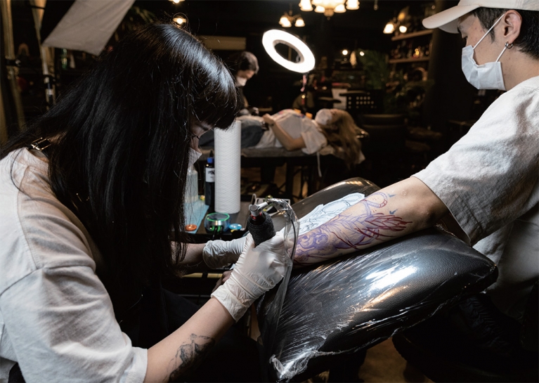 경기도 고양시의 한 타투숍. 문을 열자 따뜻한 조명과 잔잔한 음악이 반긴다. 프랜차이즈 카페처럼 편안한 분위기다. 테이블 대신 타투 베드가 있다는 점만 다르다. 한편에서는 타투이스트 ‘보보’가 타투 준비 작업으로 분주하다. 보보는 “도안은 평면이지만 피부는 입체니까 크기, 각도 등을 세심하게 고려해야 한다”고 말한다.
