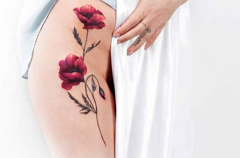 지난달 허벅지와 골반 사이에 붉은 양귀비꽃을 새긴 민모(42) 씨. 민씨는 직장 생활 때문에 오랜 기간 망설이다 비교적 늦은 나이에 용기를 냈다. “옷이나 가방 같은 물건은 헤지거나 잃어버려서 언젠가 내 곁을 떠나지만, 타투는 세월이 지나도 그럴 일 없다는 생각에 결심했죠.”