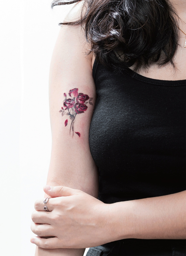 타투이스트 수백 명의 포트폴리오를 본 끝에 그는 ‘다홍’에게 작업을 맡겼다. 다홍의 타투는 이름처럼 짙고 산뜻한 붉은색 꽃이 트레이드마크다. 귀엽지만 유치하지 않고, 농염하면서도 과하지 않은 매력이 있다. 다홍은 “20대에 했던 타투가 40대, 50대가 돼서도 여전히 세련되게 보이도록 작업한다”고 말했다.