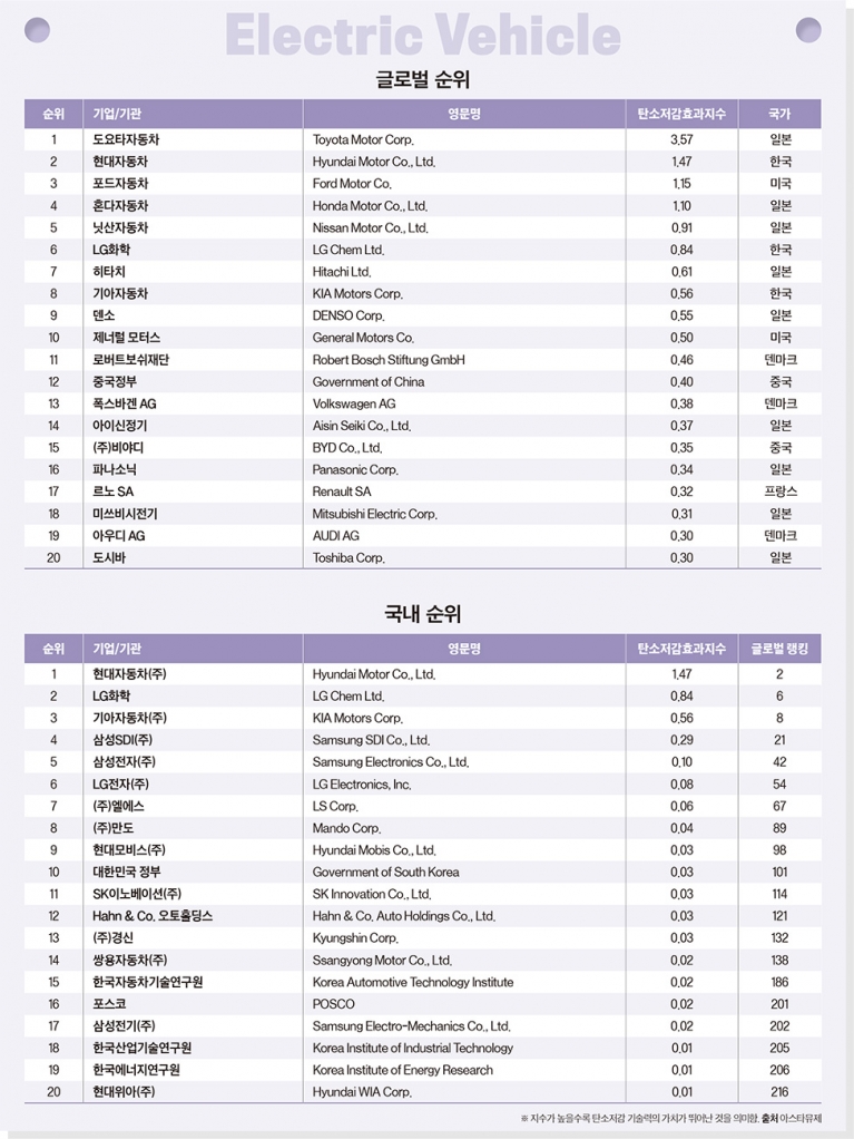 그 외 전기차 부문 10위권에 든 국내 기업/기관은 삼성SDI(4위), 삼성전자(5위), LG전자(6위), 엘에스(7위), 만도(8위), 현대모비스(9위), 대한민국 정부(10위) 순이다.