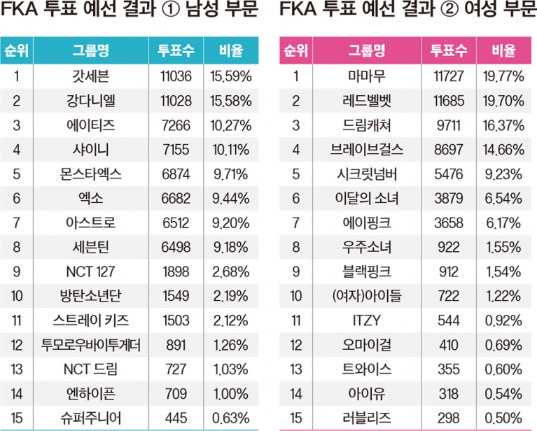 예선은 남성 부문 7만773표, 여성 부문 5만9314표로 총 13만87표를 얻으며 막을 내렸다. 치열한 상위권 다툼 끝에 남성 부문에서는 갓세븐(1위)·강다니엘(2위)·에이티즈(3위)·샤이니(4위)·몬스타엑스(5위)·엑소(6위)·아스트로(7위), 여성 부문에서는 마마무(1위)·레드벨벳(2위)·드림캐쳐(3위)·브레이브걸스(4위)·시크릿넘버(5위)·이달의 소녀(6위)·에이핑크(7위)가 본선에 진출했다.