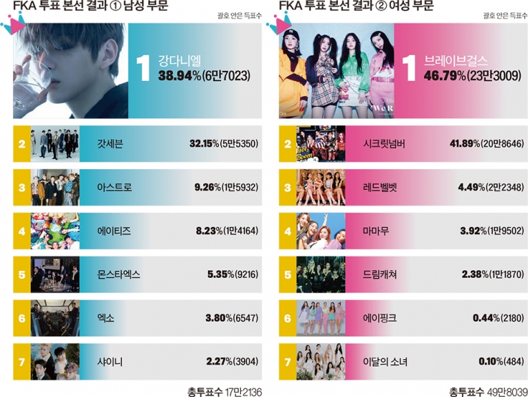 팬들의 뜨거운 관심 속에 성공리에 막을 내린 ‘제1회 FKA’. 우승자는 바로 강다니엘(남성 부문)과 브레이브걸스(여성 부문)다. 두 팀 모두 예선전에선 2위, 4위를 기록했지만 본선에서 뒷심을 발휘하며 최종 우승자가 됐다.