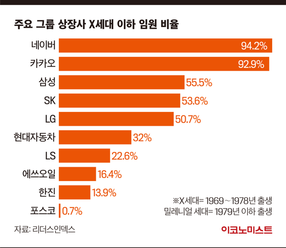 IT와 바이오 등 미래산업 분야에선 X세대 이전 임원을 거의 찾아보기 힘들다. 네이버는 전체 임원 121명 중 94.2%인 114명이 X세대 이후다. 밀레니얼 세대만 23명이다. 최근 네이버의 새 대표이사로 내정된 최수연 책임리더(1981년생)가 밀레니얼 세대에 속한다.