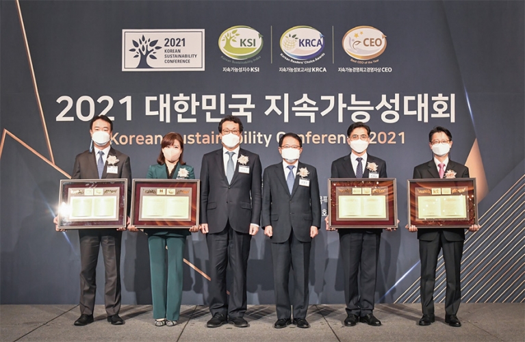 지난 11월 5일 한국표준협회가 주최하는 ‘2021 대한민국 지속가능성대회’에서 대한민국 지속가능성지수(KSI), 대한민국 지속가능성보고서상(KRCA), 대한민국 지속가능경영 최고경영자상(CEO상) 등 3개 부문에서 수상한 우수 기업 및 최고경영자에게 인증을 수여하고 시상했어요.