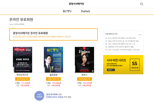 온라인 유료회원 창 하단에서 비즈니스회원을 등록할 수 있습니다. 온라인에서 월간중앙, 이코노미스트, 포브스의 모든 유료기사를 자유롭게 즐길 수 있으니 시사, 경제, 경영에 관심이 많은 사람이라면 다양한 방법으로 구독해 보길 바랍니다.