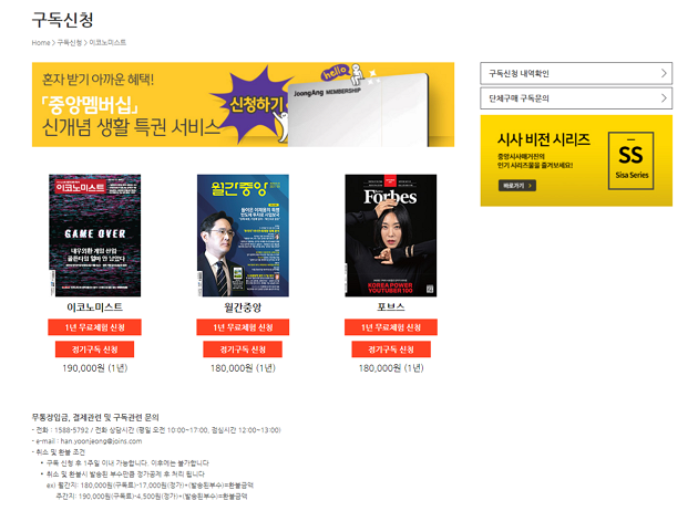 이코노미스트, 월간중앙, 포브스코리아 매거진 중 자신이 구독하고 싶은 잡지를 선택한 후 정기구독 신청 버튼을 누르고 들어가면 개인정보를 적는 창이 나옵니다. 개인정보를 적어주시면 구독신청이 완료됩니다.