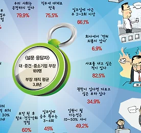 대한민국에서 부장이란 직급으로 산다는 것 대한민국에서 부장으로 산다는 것은 어떤 의미를 가질까? 드라마 에서 폭언과 폭력을 일삼는 마 부장, 무심한 척 부하직원을 챙기는 김 부장, 의 '렛잇비'에서 야근과 회식을 강요하는 이 부장은 미디어에서 그려지는 부장의 모습이다. 그렇다면 '진짜 부장의 모습'은 어떨까? 이코노미스트는 대·중견·중소·공기업 부장들을 상대로 설문조사를 했다. 1월 26~30일 닷새간 300여명을 상대로 e-메일을 보내고 회수하는 방식으로 진행했으며, 설문지는 기초조사, 회사생활, 라이프스타일, 경제생활, 사회 인식 및 정치관으로 구성했다. 설문조사 응답자는 189명. 부장으로 살아가고 있는 이들의 이야기를 한번 들어보자. ① 대한민국 부장의 회사생활 '저녁이 있는 삶'. 소박해보이지만 대한민국 직장인들에게는 사치스러운 소리다.. 더보기 이전 1 ··· 1031 1032 1033 1034 1035 1036 1037 ··· 1187 다음