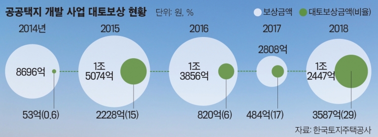 정부가 대토보상을 늘리려는 데는 다른 이유도 있다. 현금보상금이 다시 부동산시장으로 흘러들어 부동산시장이 들썩이는 것을 막겠다는 취지다. 부동산개발정보회사인 지존에 따르면 지난해 토지보상금으로 16조4000억원이 풀린데 이어 올해에는 24조원이 집행된다.