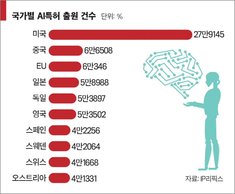 AI를 둘러싼 국가 간 경쟁도 치열하다. 1990년대 인터넷 기술 표준을 둘러싸고 주요국이 경쟁을 벌였듯 AI 기술 육성을 둘러싸고 미국·중국·일본·독일 등이 각축전을 벌이고 있다. 독일 특허 데이터베이스 기업인 IP리틱스에 따르면 국가별 AI 특허 출원건수는 미국이 27만9145건으로 1위를 기록했다. 2~5위를 합한 것보다도 많았다. 2위는 중국 6만6508건, 3위 유럽연합(EU) 6만346건, 4위 일본 5만8988건, 5위 독일 5만3897건 등 순이다. 한국은 10위 안에 들지 못했다.