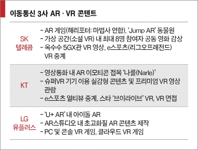 이에 최근 들어 이동통신 3사는 글로벌 콘텐트 기업과 AR·VR 콘텐트 개발 협력 체계를 구축하는 것은 물론 개인형 초과화질 실감형 서비스, VR 클라우드 게임 등을 잇따라 선보이며 몰입형 콘텐트 경험 확산에 나섰다. AR·VR 콘텐트는 데이터 소비량이 4G의 영상 스트리밍과 비교해 최소 10~30배 많아 수익 개선에 유리하다.