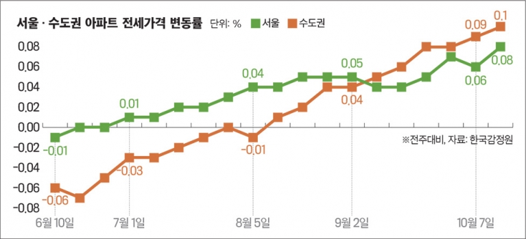한국감정원의 주간부동산 조사에서도 전세가격 상승세가 뚜렷하다. 10월 둘째 주(14일 기준) 서울 아파트 전세가격은 전주보다 0.08% 상승했다. 전 주(0.06%)보다 상승폭을 키워갔다. 둘째 주 수도권 아파트 전세가격도 0.1% 상승했다. 서울은 6월 넷째 주(24일 기준) 이후 16주간 상승세를 이어가고 있다.