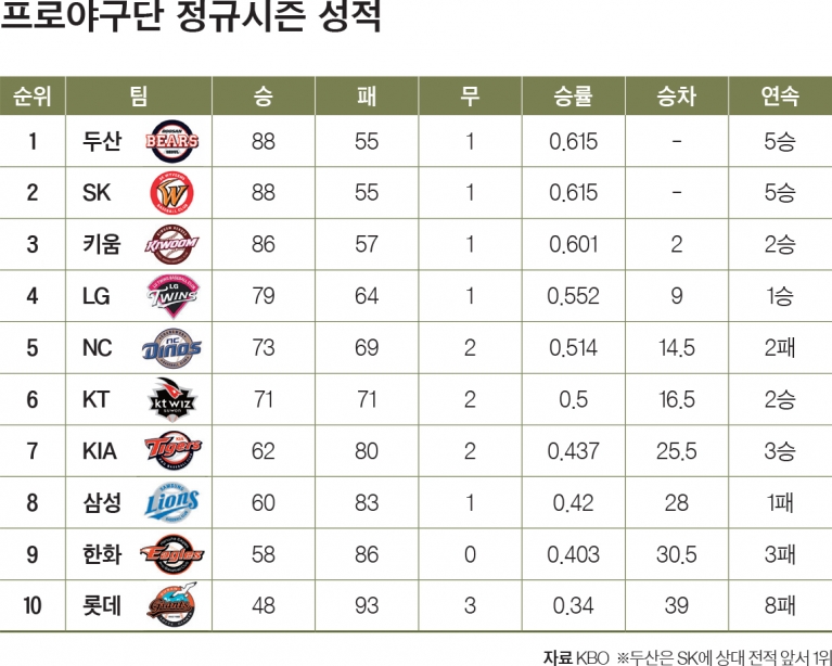 키움의 화끈한 도발과 달리 SK는 정규시즌 1위를 달리다가 막판에 두산에 발목을 잡혀 한국시리즈 진출에 실패했다. 후반기 팀 타율 8위(0.247)에 머물 정도로 뒷심이 부족했다는 평가다. 사실 9월까지만 해도 아무도 예상치 못했다. SK 와이번스는 구단 역사상 최다승 기록인 정규시즌 88승을 기록했다. 하지만 9월 태풍 북상 이후 리그 흐름이 완전히 바뀌었다. 두산과 키움이 SK 뒤를 바짝 쫓는 분위기가 됐다.