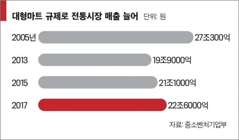 조춘한 교수는 “과거에는 상권 내부의 대·중·소 유통 간에 경쟁이 벌어졌지만 최근에는 온라인과 오프라인, 지역 상권과 지역 외상권 간의 경쟁구도로 바뀌었다”며 “규제 중심의 중소유통 활성화 정책은 적합하지 않을 수 있다”고 설명했다. 이렇다 보니 대형마트들은 신규 출점도 포기하고 있다. 이마트는 대형마트 형태로는 올해 점포를 낼 계획이 없다. 홈플러스 점포 수도 지난 3년간 변동이 없다.
