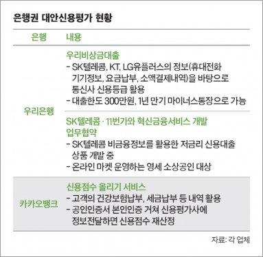 은행들은 최근 비금융데이터를 활용한 신용평가 모델을 구축하고 대출심사에 적용하고 있다. 신한은행과 NH농협은행은 금융 이력이 부족해 대출심사에서 탈락한 고객들을 재심사하는 데 통신3사 정보를 반영한 신용평가시스템을 활용한다. 통신사 이용 정보만으로 대출이 가능한 상품도 나왔다.