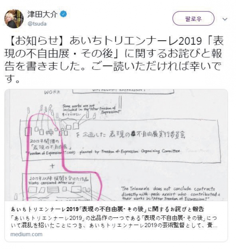우선 8월 3일 취해진 ‘표현의 부자유전, 그 후’의 전시 중단은 아이치 트리엔날레의 총책임자인 쓰다 다이스케와 오무라 히데아키 아이치현 지사의 합의로 이뤄졌다. 단순히 중앙정부의 압력에 굴복해서 지방정부가 이를 따른 것으로 해석하는 건 무리라는 것이다.