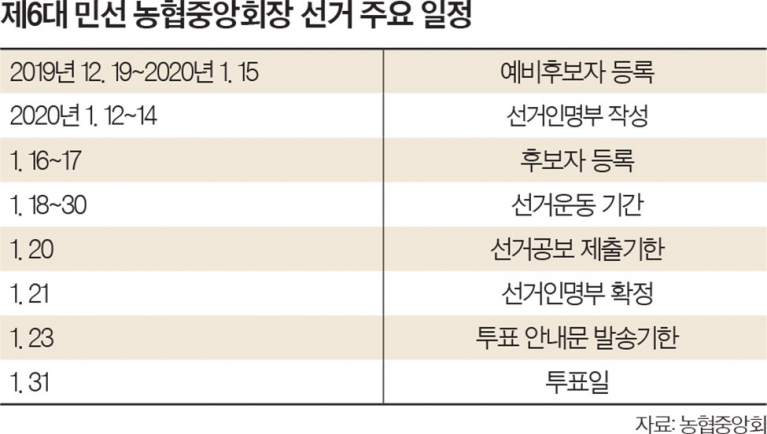 중앙선거관리위원회는 2019년 12월 9일 농협중앙회장 선거일정을 확정·공고했다. 출마를 희망하는 사람은 12월 19일부터 2020년 1월 15일까지 중앙선관위에 예비후보로 등록할 수 있다. 예비후보는 최대 28일간 명함·전화·문자메시지·정보통신망을 이용한 선거운동을 할 수 있다.