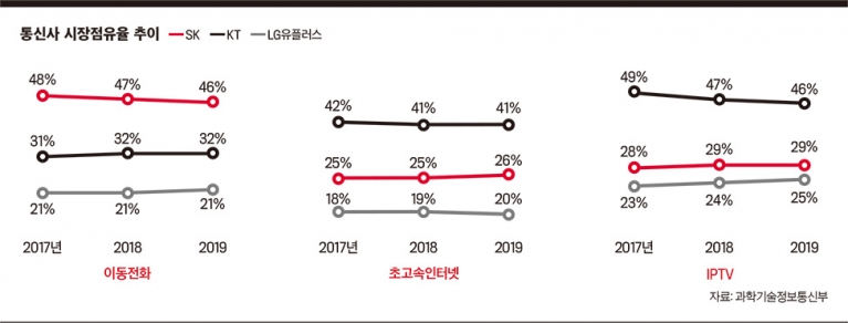 정보통신정책연구원(KISDI)의 ‘2019년도 통신시장 경쟁상황 평가 보고서’를 보면 국내 통신사들의 경쟁은 활발하지 않다. 2018년 말 알뜰폰을 제외한 국내 이통사의 가입자 점유율은 SK텔레콤 47.3%, KT 29.8%, LG유플러스 22.9%였다. 한국을 제외한 경제협력개발기구(OECD) 회원국의 1, 2위 사업자 점유율 격차 평균보다 5.4%포인트 높다. 박경신 교수는 “세계 최고 수준의 국내 이동통신 요금과 인터넷 가격은 그대로 두고 통신사를 위한 규제만 완화한 것은 특혜로 볼 수 있다”고 말했다.